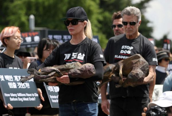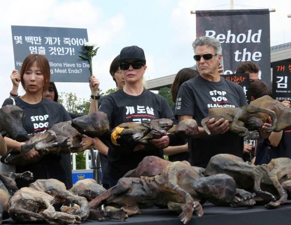 کیم بسینگر، بازیگر آمریکایی نیز به جمع فعالان حقوق حیوانات در کره پیوست تا مخالفت خود را با خوردن گوشت سگ اعلام کند.