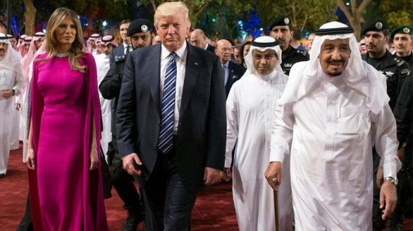 ترامپ در حرکتی بیسابقه برای یک رئیسجمهور ایالات متحده، برای نخستین سفر خارجیاش در این مقام، در ماه مه سال ۲۰۱۷ راهی ریاض شد. سعودیها استقبالی سخاوتمندانه از او داشتند، مدال یادبود تقدیمش کردند و از برنامههای خرید تسحلیات و معاملههای بزرگ تجاری خبر دادند و به رقص شمشیر دعوتش کردند.