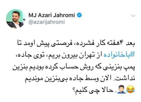 وزیر ارتباطات درباره مشکلی که بعضاً این روزها در جاده‌های کشور گریبانگیر مسافران می‌شود نوشت: ‏بعد ۴هفته کار فشرده، فرصتی پیش اومد تا ⁧ با‌ خانواده ⁩ از تهران بیرون بریم، توی جاده، پمپ بنزینی که روش حساب کرده بودیم بنزین نداشت. الان وسط جاده بی‌بنزین موندیم. حالا چه کنیم؟