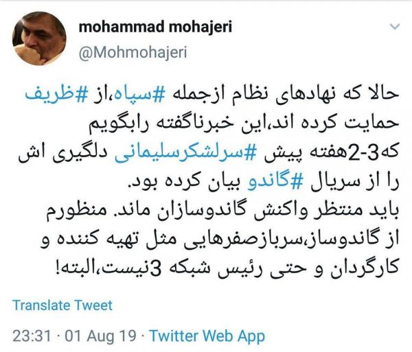 فرارو: محمد مهاجری فعال رسانه ای اصولگرا در توئیتی نوشت: حالا که نهادهای نظام از جمله سپاه،از ظریف حمایت کرده اند، این خبر ناگفته را بگویم که 2-3 هفته پیش سرلشکر سلیمانی دلگیری‌اش را از سریال گاندو بیان کرده بود. باید منتظر واکنش گاندوسازان ماند. منظورم از گاندوساز، سرباز صفرهایی مثل تهیه کننده و کارگردان و حتی رئیس شبکه 3نیست،البته!