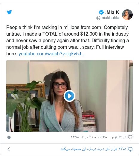 رو که‌ نیست..این آخه خیلی معروفه فیلمهای هارد کور پورن بازی میکرده که الان همش تو پورن هاب و ..موجوده،از اون دو آتشه ها بوده سکس خفن و حریصانه بعد الان جوری حرف میزنه انگار یه دختر ساده و معصومه که ازش سو استفاده شده!! کافیه برید فیلمهاشو ببینید چون جنبه داستانی و کمدی هم داره مخصوصا که حجاب سرش میکنه.واقعا آدم نمیدونه چی بگه،به عالم و آدم داده حالا اومده اینحرفها رو میزنه.نه اینکه کلا مشکلی باشه اینجور شغل و فیلمهایی هر کی مسئول زندگی خودشه و آزاده اما دیگه این مرخرفات رو نیا بگو.