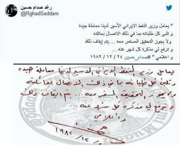 این دستنوشته مربوط به تاریخ ۲۴ دسامبر ۸۲ است (۳ دیماه ۶۱) است که در آن صدام دستور داده است: «با وزیر نفت ایرانی اسیر شده، رفتار خوبی شده و تمامی نیازهایش از جمله تماس با خانواده اش فراهم شود و هرگز نباید به طور مستمر از او بازجویی کرد...باید همه اینها متوقف شوند و هر ماه یک گزارش در این خصوص برای من ارسال شود.»