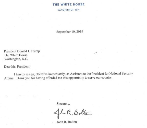 بولتون در این استعفانامه اعلام کرده است که از سمت معاون رئیس جمهور در امور امنیت ملی استعفا داده و از وی به دلیل دادن فرصت برای خدمت به آمریکا قدردانی کرده است.