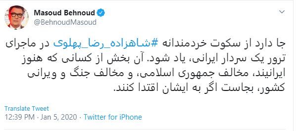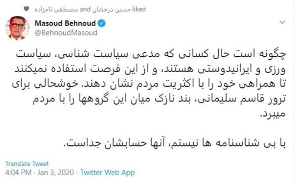 توئیت های مسعود بهنود در واکنش به ترور قاسم سلیمانی