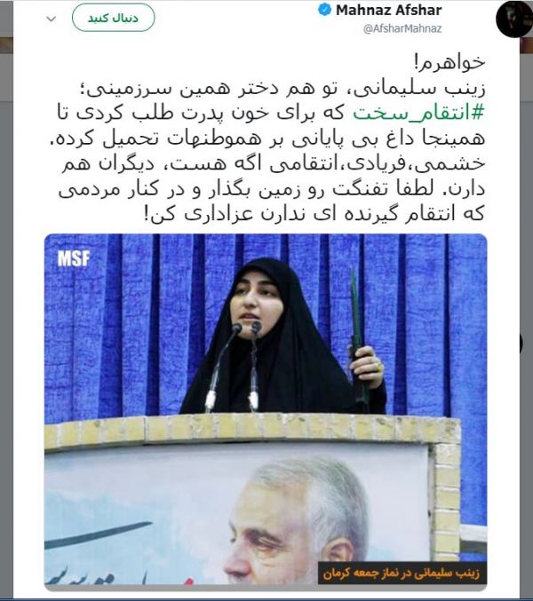 مهناز افشار ، بازیگر سینما، تئاتر و تلویزیون در جدیدترین توئیت و همچنین پست اینستاگرامی خطاب به زینب سلیمانی فرزند قاسم سلیمانی واکنش نشان داده است!