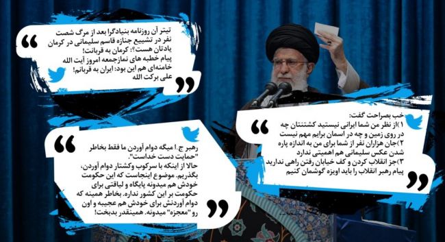 صدای آمریکا :سخنرانی آیت الله خامنهای در نماز جمعه تهران واکنش های متفاوتی برانگیخت و برخی از کاربران شبکه های اجتماعی سخنان او را تکرار سخنان کلیشه ای گذشته دانستند.رهبر جمهوری اسلامی در حالی در پی حوادث اخیر و سقوط هواپیمای مسافربری پس از هشت سال نماز جمعه تهران را برگزار کرد که انتظار می رفت در شرایط دشوار جمهوری اسلامی از موضعی متفاوت سخن بگوید، اما کاربران شبکه های اجتماعی معتقدند که سخنان او فرقی با گذشته نداشت.
