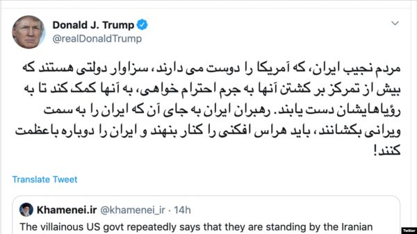 دونالد ترامپ با «ریتوییت» (باز توییت) کردن توییت علی خامنه‌ای به فارسی نوشته است: «مردم نجیب ایران، که آمریکا را دوست می دارند، سزاوار دولتی هستند که بیش از تمرکز بر کشتن آنها به جرم احترام خواهی، به آنها کمک کند تا به رؤیاهایشان دست یابند. رهبران ایران به جای آن که ایران را به سمت ویرانی بکشانند، باید هراس افکنی را کنار بنهند و ایران را دوباره باعظمت کنند!»