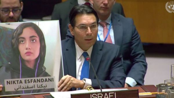 سفیر اسرائیل در سازمان ملل می گوید کشورش کنار مردم ایران ایستاده است.دنی دنون، سفیر اسرائیل در سازمان ملل، روز سه شنبه ۱ بهمن در یک سخنرانی تصویر نیکتا اسفندانی، یکی از جانباختگان اعتراضات آبان ماه در ایران، را بالا گرفت و این مطلب را اعلام کرد.