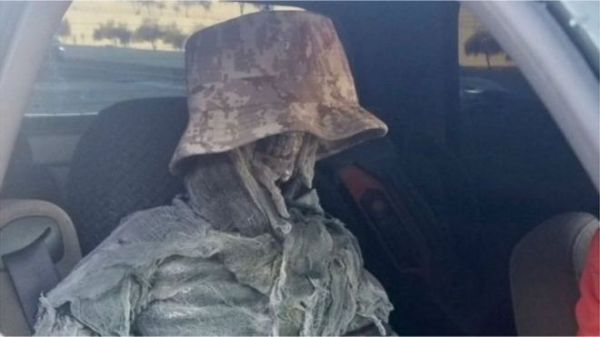 اداره امنیت عمومی ایالت آریزونا گفته است که "این فرد ۶۲ ساله، زمانی دستگیر شد که یک مامور پلیس متوجه شد این اسکلت که کلاهی بر سر داشت با طنابی به صندلی بسته شده است."
