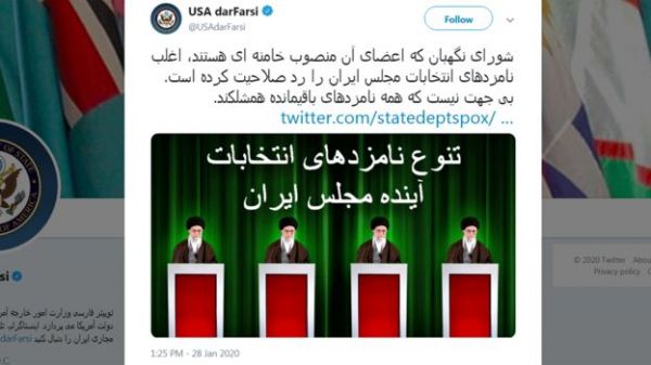 توییتر وزارت خارجه آمریکا نحوه برگزاری انتخابات ایران را به استهزاء گرفته است بی بی سی :وزارت خارجه آمریکا گزینش نامزدهای انتخاباتی ایران را به استهزا گرفته و جناح اصلاحطلب در جمهوری اسلامی رایدهی برای بیش از نیمی از کرسیهای مجلس را بی اثر دانسته است.مورگان اورتاگوس، سخنگوی وزارت خارجه آمریکا در توییتر خود با اشاره به گزینش نامزدهای انتخابات مجلس توسط شورای نگهبان، گفته است: "شورای نگهبان که اعضای آن منصوب خامنهای هستند، اغلب نامزدهای انتخابات مجلس ایران را رد صلاحیت کرده است. بیجهت نیست که همه نامزدهای باقیمانده همشکلاند ."