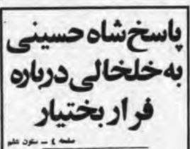 شاهحسینی به من گفت، با دستور امام خمینی بختیار را در حیاط دیگر مدرسه رفاه نگهداشتهایمصادق خلخالی در گفتگوی خود که در کیهان مورخ، ۲۷ بهمن ۵۸، منتشر شد، به تشریح چگونگی ماجرای شاپور بختیار پرداخت و گفت: «آنچه مسلم است و من اطلاع دارم، آقای بختیار در طبقه پایین مدرسه رفاه اسیر بوده و آقای شاهحسینی نیز در جریان امر قرار داشت، به طوری که پس از دستگیری بختیار، شاهحسینی در مدرسه رفاه به من گفت، با دستور امام خمینی بختیار را در حیاط دیگر مدرسه رفاه نگهداشتهایم. من نخست باور کردم و پنج شش ساعت بعد وقتی که خدمت امام رسیدم، امام فرمودند: من از جریان اطلاعی ندارم؛ و من در حالی که نخست تعجب کرده بودم که چگونه شاهحسینی این ماجرا را از قول امام گفته است، مجددا به مدرسه رفاه آمدم تا ببینم شاپور بختیار را کجا بردهاند؛ و سرانجام با تلاش زیاد موفق شدم شاهحسینی را ملاقات کنم، ولی با کمال تاسف آقای شاه حسینی یکمرتبه همه چیز را انکار کرد و به من گفت: من اصلا بختیار را ندیدهام. با اینکه تعدد زیادی از افراد سپاه پاسداران و همچنین تیمسار امیر رحیمی با چشم خود بختیار را دیده و حتی به اشتباه او را مرغ آتشین خوانده است، حال آنکه بختیار مدعی بود که او مرغ طوفان است. اکنون با گذشت چندین ماه این ملت ایران است که باید بپرسد و سوال کند فرار بختیار چگونه انجام گرفته است؟