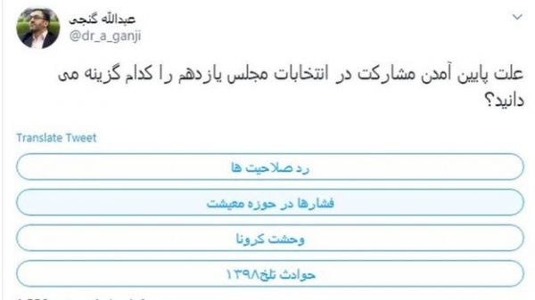آقای گنجی درباره "علت پایین آمدن مشارکت در انتخابات مجلس یازدهم" در توییتر خود نظرخواهی گذاشته و از شهروندان ایرانی پرسیده دلیل کاهش مشارکت را چه می دانند.