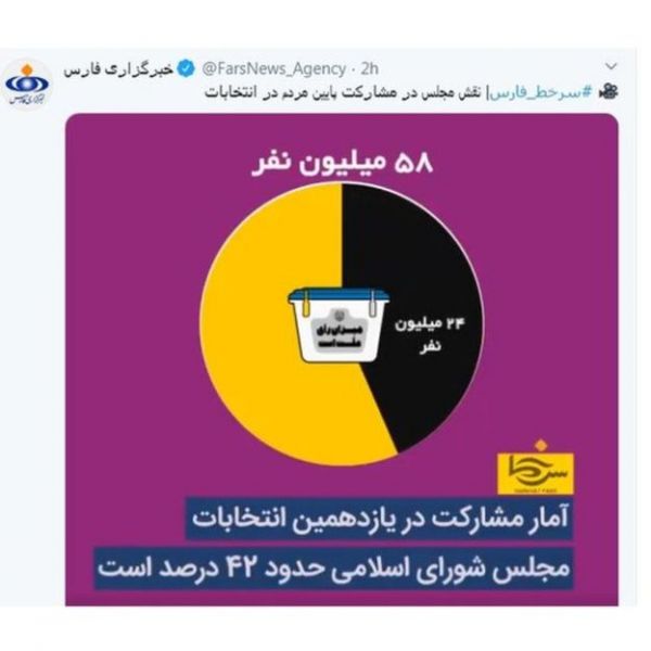 بی بی سی :یک روز پس از انتخابات دوره یازدهم مجلس شورای اسلامی در ایران، خبرگزاری فارس وابسته به سپاه پاسداران در حساب توئیترش میزان مشارکت در انتخابات مجلس یازدهم را در حدود ۴۲ درصد عنوان کرده است.این نهاد وابسته به سپاه کاهش میزان مشارکت نسبت به دورههای قبل را "افت شدید" توصیف کرده است.