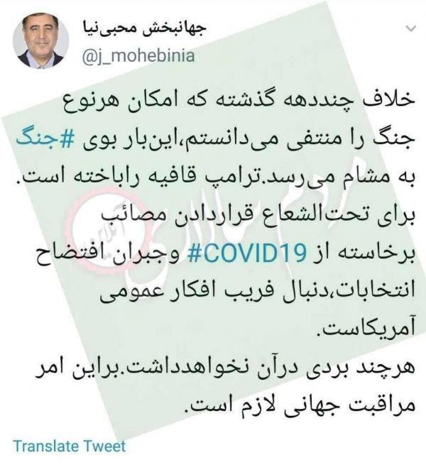 جهانبخش محبینیا، نماینده میاندوآب در مجلس شورای اسلامی در توئیتر نوشت: خلاف چند دهه گذشته که امکان هرنوع جنگ را منتفی میدانستم، اینبار بوی جنگ به مشام میرسد. ترامپ قافیه راباخته است. برای تحتالشعاع قراردادن مصائب برخاسته از COVID19 وجبران افتضاح انتخابات، دنبال فریب افکار عمومی آمریکاست. هرچند بردی درآن نخواهد داشت.براین امر مراقبت جهانی لازم است.