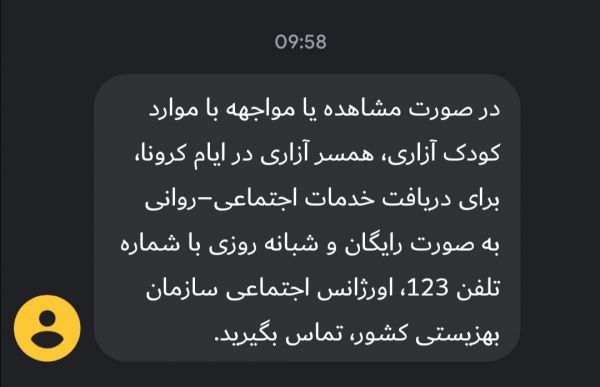 صفحه اولاخبار ایران و جهانپیامک جدید و متفاوت وزارت بهداشت به شهروندانپیامک جدید و متفاوت وزارت بهداشت به شهروندان+7رأی دهید-5جمعه ۲۲ فروردین ۱۳۹۹ - ۱۰ آوریل ۲۰۲۰پیامک جدید وزارت بهداشت با موضوع جلوگیری از خشونت خانگی در ایام شیوع کرونا برای شهروندان ارسال شد.+7رأی دهید-5 نظر شما چیست؟جهت درج دیدگاه خود می بایست در سایت عضو شده و لوگین نمایید.نام نویسیورود