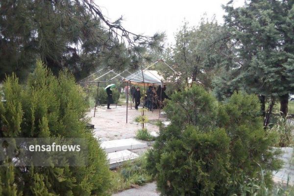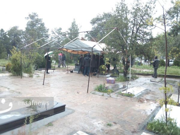 مراسم خاکسپاری بدون اینکه مستحبات را برای میت انجام دهند، بدون اینکه صورت میت را باز کنند. مسئول دفن به سرعت شروع به چیدن لحد میکند، بعد از آنکه لحد را چید یک کیسه آهک را با سر بیل پاره میکند و روی لحد میریزد، کسانی که دور قبرند کمی خود را به عقب میکشند.[به احترام خانواده متوفی عکسی از متوفی خاکسپاری گرفته نشده است.]