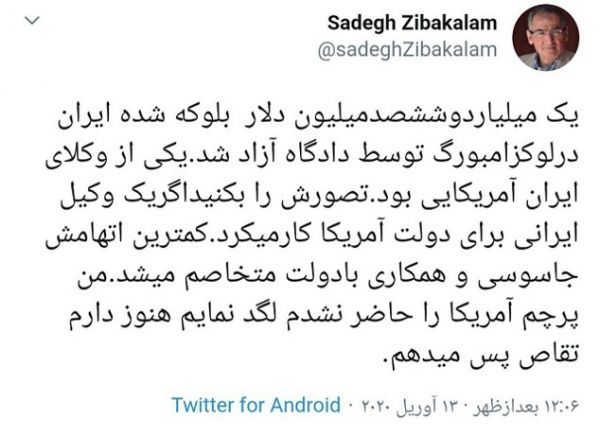 در شماره ۲۶ فروردین آن جریده شریفه در پاسخ به توئیتی که بنده در خصوص یک وکیل آمریکایی که برای دولت ایران کار میکند مطالبی را علیه اینجانب مرقوم داشته بودید.صورت مسئله باین شکل بود که ایشان و همکارانشان موفق میشوند یک میلیارد و ۶۰۰ میلیون دلار دارایی های ایران در لوکزامبورگ را آزاد نمایند.بنده در توئیتم نوشته بودم اگر یک وکیل ایرانی برای دولت آمریکا کار میکرد کمترین اتهامش جاسوسی و همکاری با دولت متخاصم می شد.