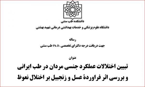 - "تبیین اختلالات عملکرد جنسی مردان در طب ایرانی و بررسی اثر فراورده عسل و زنجبیل بر اختلال نعوظ"، (دانشگاه شهید بهشتی ۱۳۹۷)