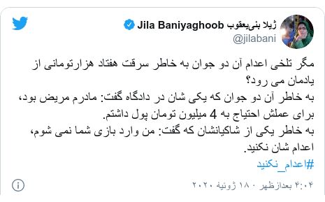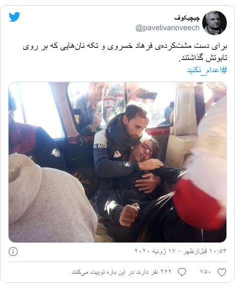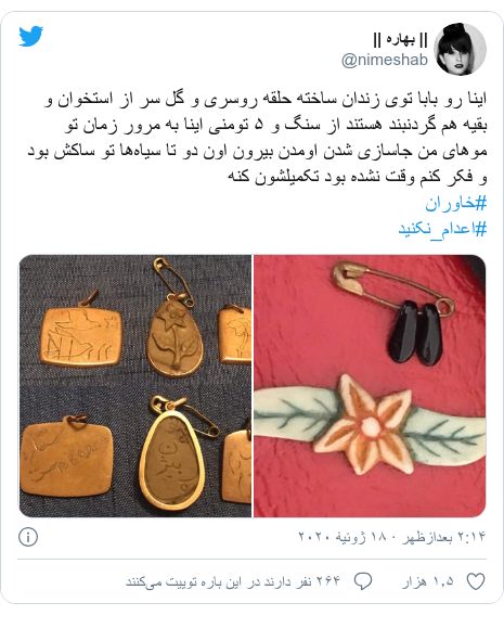 مهرنوش نوشت: "برای نصیر، همسایه افغانستانی ما که دوست برادرم بود و هر وقت ما مسافرت میرفتیم میاومد شب خونه ما میخوابید که ما خیالمون از امنیت خونه راحت باشه و بعد فرستادنش سوریه و تمامش کردند. #اعدام_نکنید #به_طالبان_باج_ندهید"