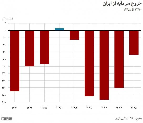 از آغاز دهه ۹۰ تا پایان پارسال فقط در یک سال از این دوره ۹ ساله، خالص حساب سرمایه مثبت بوده که به سال ۱۳۹۳ بازمیگردد. در دیگر هشت سال این دوره زمانی، حساب خالص سرمایه منفی بود که برگریز مداوم سرمایه از ایران در دهه اخیر دلالت میکند.روند خروج سرمایه از ایران از سال ۹۴ تشدید شده و در سال ۹۶ به اوج خود رسد که خالص حساب سرمایه در این سال بیش از ۱۹ میلیارد دلار منفی بود.