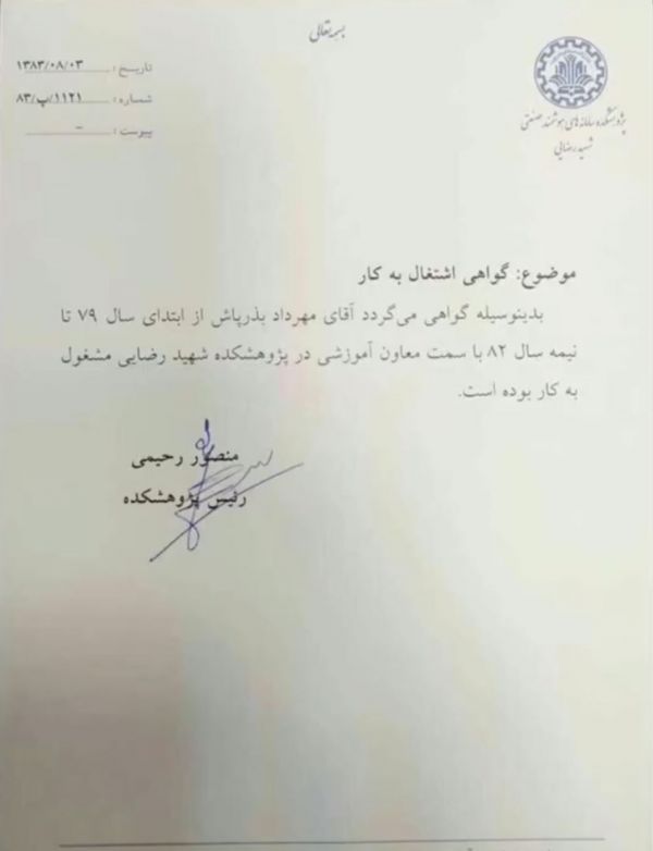 حامیان او در شبکه اجتماعی توییتر با انتشار نامهای از «پژوهشکده سامانههای هوشمند صنعتی شهید رضایی»، سعی کردند تا فعالیت او را به عنوان معاون آموزشی این پژوهشگاه، حد فاصل سالهای ۷۹ تا ۸۲ تایید کنند.اما همین اقدام خود به دردسری تازه بدل شد؛ چراکه گروهی دیگر از کاربران شبکههای اجتماعی از بدون مهر بودن این نامه و فقدان مخاطب در متن آن نوشتند، ولی در این میان پایگاه خبری دیدهبان ایرانیان از اساس نامه منتشر شده را زیرسوال برد و نوشت که «طبق آگهی تاسیس؛ این موسسه، سال ۱۳۹۲ ثبت و تاسیس شده است.»