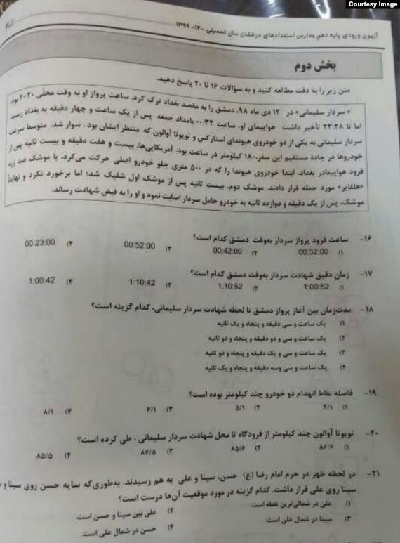 طراحان سؤال، ماجرای اصابت موشک به خودروی قاسم سلیمانی را با ادبیات ایدئولوژیک، موضوع سؤالات ریاضی و فیزیک قرار دادهاند و از متقاضیان میخواهند فواصل حرکت و ساعت فرود و زمان اصابت موشک را محاسبه کنند.