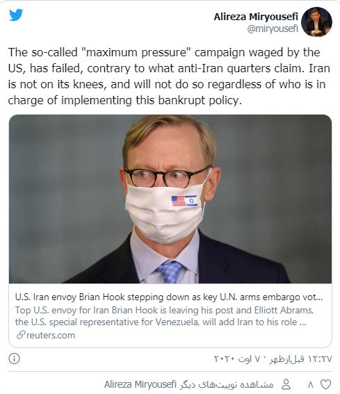 ایران اینترنشنال: سخنگوی نمایندگی ایران در سازمان ملل متحد اعلام کرد که استعفای برایان هوک، نماینده ویژه آمریکا در امور ایران، از نظر جمهوری اسلامی مساله «تعیینکنندهای» محسوب نمیشود.علیرضا میریوسفی در عین حال به خبرگزاری رویترز گفت: «کمپین به اصطلاح فشار حداکثری که حکومت آمریکا راه انداخته، شکست خورده است.»