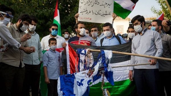 معترضان مقابل سفارت امارات در تهران پرچم اسرائیل را آتش زدندامارات پس از مصر و اردن سومین کشور عربی است که با اسرائیل روابط دیپلماتیک رسمی برقرار میکند؛ هرچند که سالهاست روابط غیررسمی و غیرعلنی در جریان بوده است. امارات و اسرائیل سه روز پیش با میانجیگری دونالد ترامپ برای عادیسازی روابط به توافق رسیدند.اسرائیل با چندین کشور دیگر در جهان عرب نیز روابط غیرعلنی دارد و امیدوار است با دیگر کشورهای حاشیه خلیج فارس به توافق مشابهی برسد.