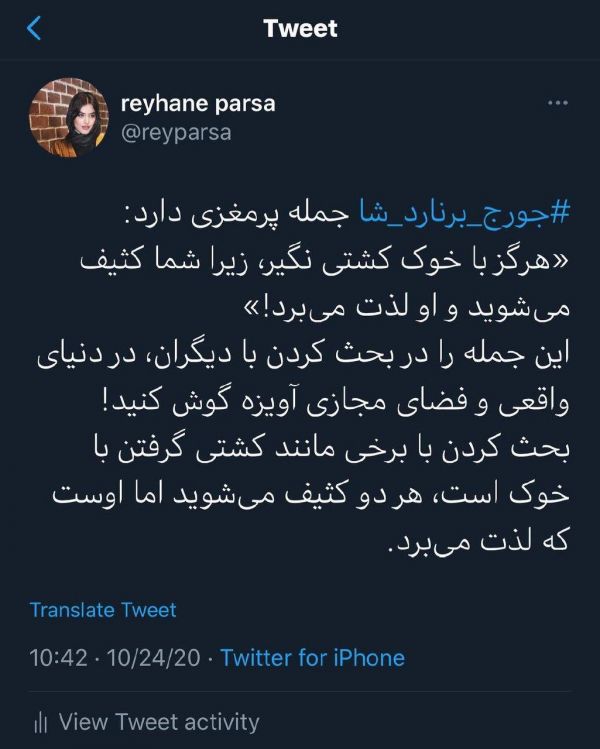 ریحانه پارسا که همواره جز بازیگران پر حاشیه کشور است، در صفحه اینستاگرام خود نوشت: "جورج برنارد شا جمله پر مغزی دارد:هرگز با خوک کشتی نگیر، زیرا شما کثیف میشوید و او لذت میبرد!
