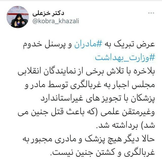 ایران وایر :ماهرخ غلامحسین پورصبح روز پنجشنبه ۲۵دی۱۳۹۹ «کبری خزعلی»، رئیس شورای فرهنگی و اجتماعی زنان و عضو شورای عالی انقلاب فرهنگی، در صفحه توییترش نوشت: «با تلاش نمایندگان انقلابی مجلس، اجبار مادران به غربالگری پیش از زایمان» برداشته شد.