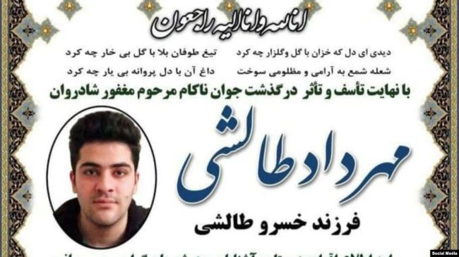 مهرداد طالشی، جوان ۲۱ ساله اهل دیواندره که که چند روز بعد از بازداشت، جنازهاش به خانواده او تحویل داده شدخانواده مهرداد طالشی، جوان ۲۱ ساله اهل دیواندره که که چند روز بعد از بازداشت، جنازهاش به خانواده او تحویل داده شد، اطلاعیه نیروی انتظامی مبنی بر جان باختن او بر اثر «ایست قلبی» را «کذب محض» خواندند.به گزارش سازمان حقوق بشری ههنگاو، آقای طالشی روز ۱۳ بهمن توسط ماموران امنیتی در متروی بازار تهران به اتهام «حمل مواد مخدر» به همراه یک نفر دیگر بازداشت شده و به آگاهی شاپور برده شد و دو روز پس از آن در تماسی از سوی بیمارستان بهارلو در تهران به خانواده او اعلام شد که جسد او در این بیمارستان است.