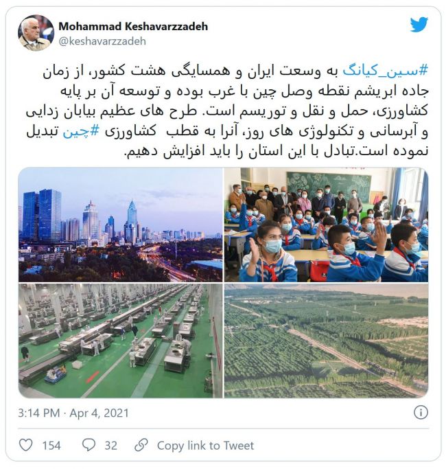 همزمان با انتشار توئیت‌های مبالغه‌آمیز کشاورززاده، خبرگزاری دولتی ایرنا به نقل از رسانه‌های چین نوشته که "سفر اخیر دیپلمات‌های ایران به این منطقه و گزارش‌های آنان خلاف اتهامات را نشان داد".