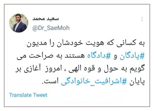 سعید محمد از نامزدهای انتخابات ریاست جمهوری به لاریجانی پاسخ داده که «به کسانی که هویتشان را مدیون پادگان و دادگاه هستند به صراحت میگویم به حول و قوه الهی، امروز آغازی بر پایان اشرافیت خانوادگی است.» لاریجانی که سابقه حضور در سپاه هم دارد، امروز در حین نامنویسی برای انتخابات گفتهبود حوزه اقتصاد، پادگان و دادگاه نیست که با تشر و دستور اداره شود.۴۳