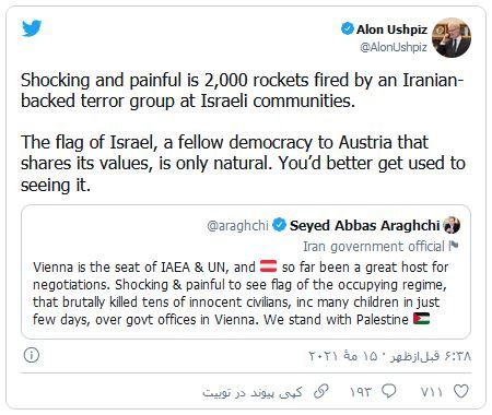 این اظهارات عراقچی با واکنش اَلون اوشپیز، مدیرکل وزارت امورخارجه اسرائیل مواجه شد. اوشپیز در توئیتر خطاب به عراقچی نوشت: «شوکه کننده و دردآور دو هزار راکتی است که توسط گروه مورد حمایت ایران به سوی جوامع اسرائیلی شلیک شده است.»ارتش اسرائیل صبح روز شنبه، اعلام کرد از زمان آغاز درگیریها، 2300 موشک از غزه به سمت اسرائیل شلیک شده که 1000 فروند از آنها رهگیری و منهدم شدند. پرتاب 380 موشک هم ناکام ماند.