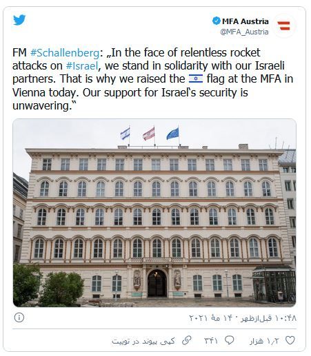این وزارت همچنین در صفحه توئیترش به نقل از الکساندر شالنبرگ، وزیر امور خارجه نوشت: «در مقابل حملات موشکی ادامهدار علیه اسرائیل، ما با همپیمانان اسرائیلیمان ابراز همبستگی میکنیم و از این رو امروز پرچم اسرائیل را بر فراز موزه هنرهای زیبای وین برافراشتیم. حمایت ما از اسرائیل خدشهناپذیر است.»پیشتر عباس عراقچی، مذاکرهکننده ارشد ایران هم به برافراشته شدن پرچم اسرائیل در اتریش اعتراض کرده و گفته بود دیدن پرچم اسرائیل « در بیشتر دفاتر اداری دولتی در وین، بسیار تکان دهنده و دردناک است.»