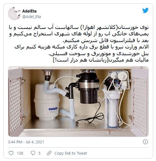 دویچه وله :یک مقام دولتی در خوزستان از شهروندان این استان خواست برای مقابله با کم آبی در خانه آب ذخیره کنند. به گفته مدیرعامل آب و فاضلاب خوزستان کمبود آب از دیگر سالها حادتر است.مدیرعامل شرکت آب و فاضلاب خوزستان از ساکنان این استان خواست آب ذخیره کنند. محمدرضا کرمینژاد با اشاره به مشکل کمبود آب تصریح کرد: «بهتر است به ازای هر نفر در خوزستان ۱۰۰ لیتر در شبانهروز ذخیره آبی در خانه وجود داشته باشد.»