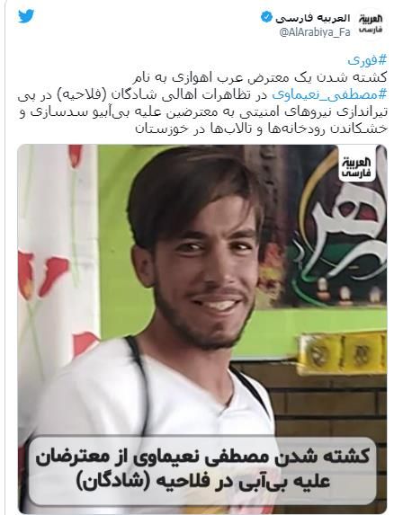 العربیه: در پی کشته شدن یک شهروند عرب اهوازی به نام «مصطفی نعیماوی» در دومین شب اعتراضات به شرایط بیآبی در خوزستان، یک مقام مسئول در شهر فلاحیه (شادگان) جنوب این استان، مدعی شد که این معترض توسط آنچه «اغتشاشگران» نامید و نه نیروهای امنیتی، کشته شده است.امید صبریپور، سرپرست فرمانداری شادگان روز شنبه در گفتوگو با خبرگزاری «ایسنا» اظهار کرد: «شب گذشته (25 تیرماه) برخی از مردم شادگان در حمایت از معترضان به وضعیت کمآبی در شهرستانهای دیگر، در سطح شهر تجمع کردند. در جریان این تجمع، افراد فرصتطلب و اغتشاشگر به سمت ماموران نیروهای امنیتی و تجمعکنندگان تیراندازی کردند که تیر به یک رهگذر که جوانی 30 ساله بود، اصابت و منجر به مرگ آن شد.»