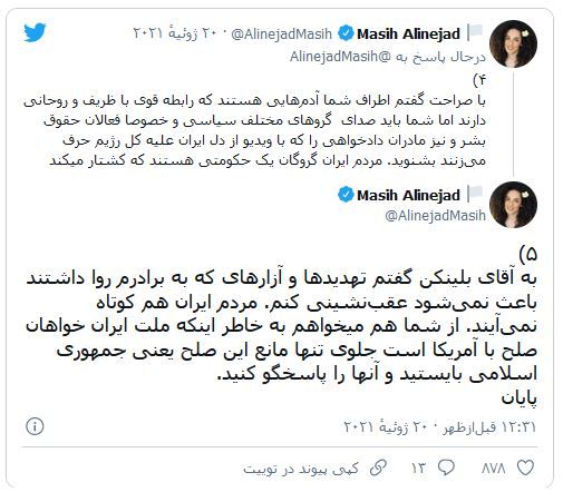 مسیح علینژاد نیز در رشتهتوئیتی با اشاره به این گفتوگوی تلفنی نوشته است که به وزیر خارجه آمریکا درباره حوادث خوزستان و سرکوب معترضان به بحران آب و شهروندان دوتابعیتی زندانی در ایران، حوادث آبان ۹۸ و همچنین سرنگونی هواپیمای اوکراینی توسط سپاه پاسداران اشاره کرده و از دولت آمریکا خواسته است که حکومت ایران را «پاسخگو کند».