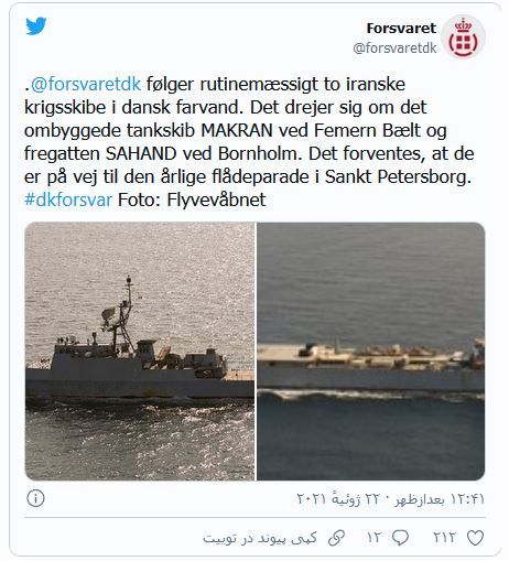 نیروی دریایی دانمارک با انتشار تصاویر این دو ناو در توییتر، اعلام کرد شناورهای ایرانی از تنگه فیهمارن بلت میان دانمارک و آلمان و نزدیکی جزیره بورنهولم، متعلق به این کشور عبور کرده اند.