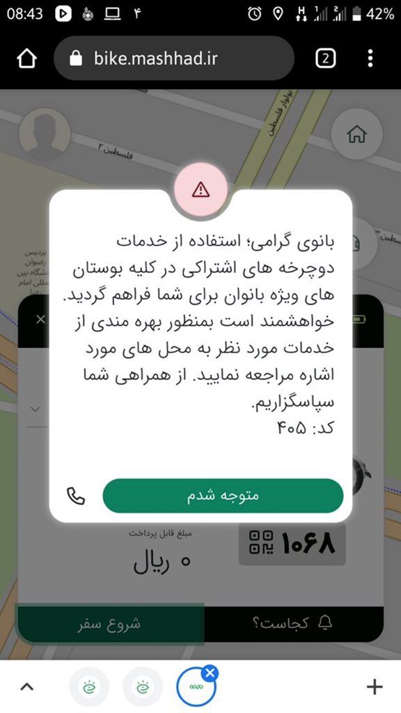 دوچرخههای اشتراکی از سوی شهرداری مشهد در اختیار شهروندان قرار میگیرد. آذر ماه سال گذشته نیز در اصفهان اعلام شد که استفاده زنان از دوچرخههای اشتراکی ممنوع است.