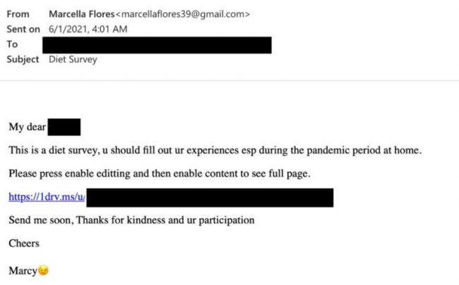 متن نامهای که به انگلیسی در آن از طرف 'مارسی' نوشته شده: ... عزیزم، این یک تحقیق درباره رژیم غذایی است مخصوصا در دوران قرنطینه کرونا در خانه. لطفا گزینه ویرایش و سپس محتوا را فعال کن تا صفحه کامل را ببینی.هدف مارسلا فلورز چه بود؟شرکت امنیت سایبری پروفپوینت گمان میبرد که هکرهایی که شخصیت مارسی را خلق کردهاند، با سپاه پاسداران انقلاب اسلامی مرتبط باشند.