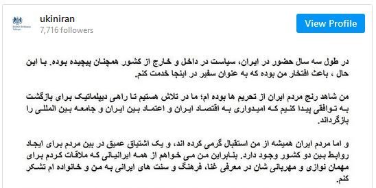 سفیر بریتانیا در پیامی به مناسبت اتمام مأموریتش: من شاهد رنج مردم ایران بودم