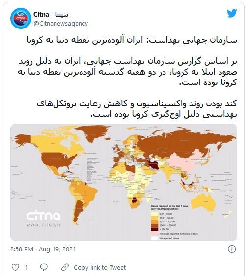 در ایران از ۲۱ بهمن که واکسیناسیون آغاز شد تا سیام مرداد در مجموع اندکی بیش از ۲۲ میلیون دوز واکسن تزریق شده و فقط حدود پنج و نیم میلیون نفر به طور کامل واکسینه شدهاند.