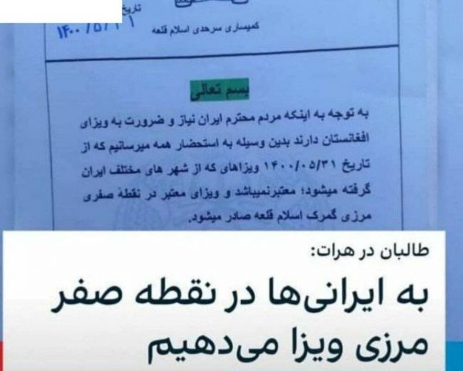 طالبان در یک بیانیه اعلام کرده است که به ایرانیها برای ورود به افغانستان در نقطهی مرزی ویزا صادر میشود. تنها ویزای معتبر گمرک اسلام قلعه در نقطه صفر مرزی است.