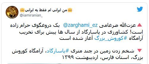 یک کاربر فضای مجازی با انتشار فیلمی از کشاورزی و شخم زدن زمین در فاصله بسیار نزدیک مقبره کوروش که ظاهرا مربوط به اردیبهشت ۹۹ است ضرغامی را دروغگو خوانده و میگوید این کار از سالها پیش انجام میشود.