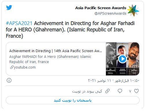اصغر فرهادی با فیلم «قهرمان» بهترین کارگردان جوایز آسیاپاسیفیک شد