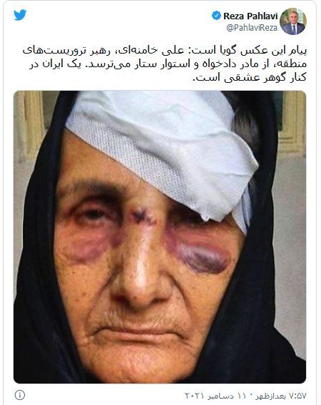 شاهزاده رضا پهلویصدای آمریکا :شاهزاده رضا پهلوی با انتشار توییتی به خبر حمله به مادر ستار بهشتی واکنش نشان داد.در این توییت که عصر شنبه منتشر شد، شاهزاده رضا پهلوی ضمن بازنشر تصویر صورت آسیبدیده و سر باندپیچیشده گوهر عشقی، مادر ستار بهشتی، نوشته است: «پیام این عکس گویا است: علی خامنهای، رهبر تروریستهای منطقه، از مادر دادخواه و استوار ستار میترسد.»