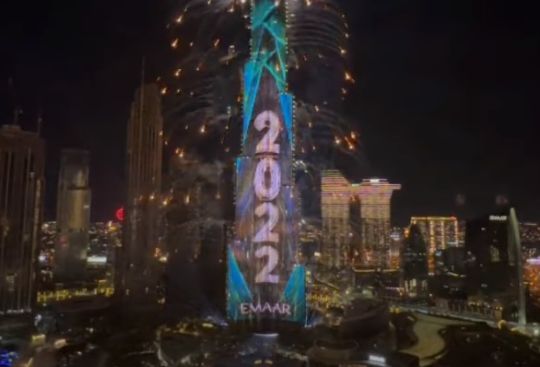 آتش بازی برج خلیفه دوبی لحظه ورود به سال 2022. برج خلیفه یا برج دبی آسمانخراشی در شهر دبی امارات متحده عربی است. این برج با ۱۶۳ طبقه قابل استفاده و ۸۲۸ متر بلندی، هماکنون بلندترین سازه و آسمانخراش ساخته شده به دست انسان است.