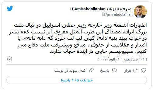 آقای امیرعبداللهیان افزود که «با اقتدار و عقلانیت از حقوق، منافع و پیشرفت ملت دفاع میکنیم».وزیر خارجه ایران در ادامه توئیت خود، این تهدید تلویحی را نیز در مورد اسرائیل اضافه کرد که «صهیونیسم جایی در آینده جهان ندارد».