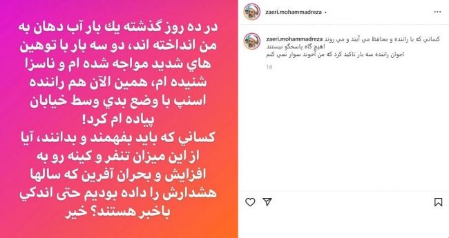 پس از انتشار ویدیوهایی از برخورد مردم با تعدادی از روحانیون در روزهای گذشته، یک روحانی اصولگرا نیز از افزایش توهین ها به خود در روزهای اخیر خبر داد.محمدرضا زائری، از روحانیون اصولگرا، در اینستاگرام خود نوشت که در ده روز گذشته یک بار به او «آب دهان» انداختهاند، دوسه بار با «توهینهای شدید» مواجه شده و راننده اسنپ هم او را پیاده کرده و گفته: «من آخوند سوار نمیکنم.»